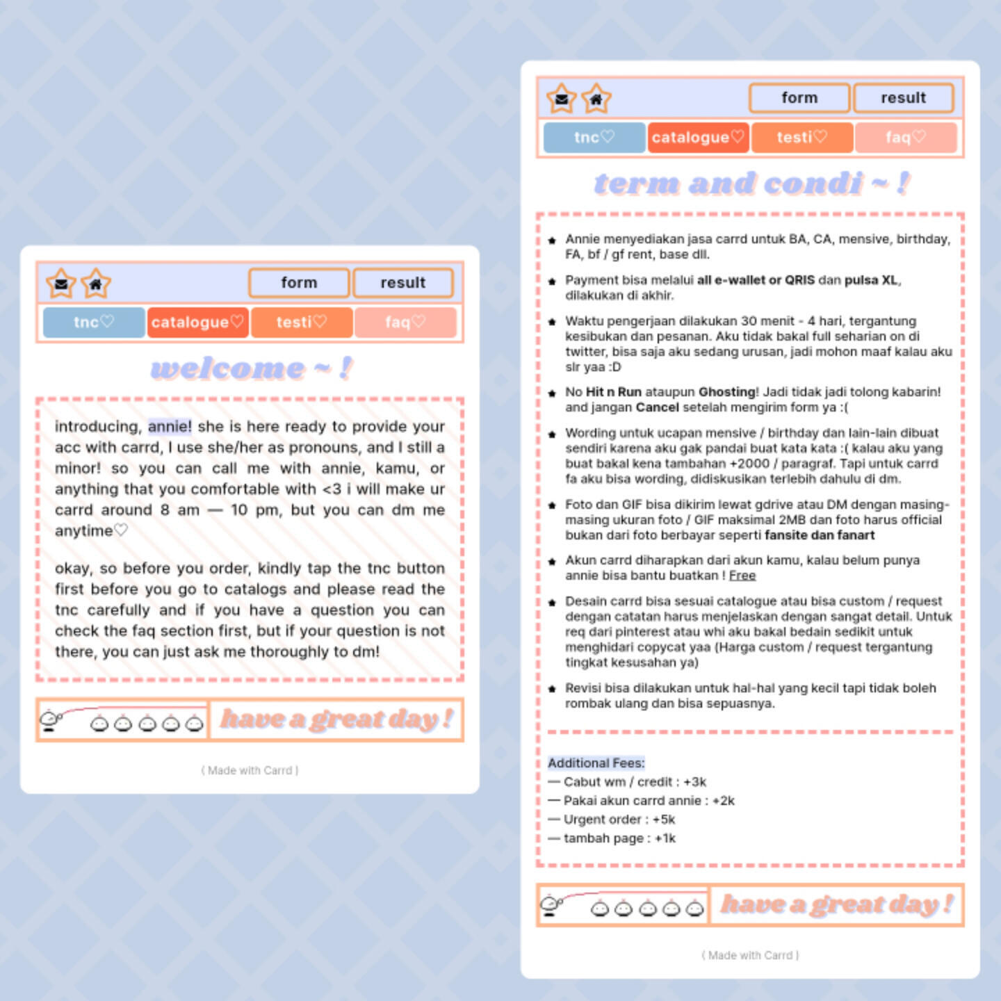 jangan terpaku sama catalogue yaahh, pokoknya kamu bisa ubah semua carrd yang ada di catalogue ini! bisa ditambah atau dikurangin, ubah warna, bisa diubah buat mensive, birthday, fa, ca, ba, dll.